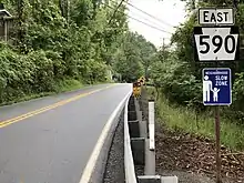 When Pennsylvania legislated routes in 1911, what is now PA 590 was designated as Legislative Route 172 between Elmhurst and Hamlin and as Legislative Route 255 between Hawley and Lackawaxen.[10] PA 590 was designated in 1928 to run from US 611 (now PA 435) in Elmhurst east to PA 37/PA 237 in Lackawaxen while the current alignment between Lackawaxen and Greeley was designated as part of PA 37. At this time, PA 590 was paved between US 611 and PA 690 and for a short distance to the west of US 6.[2] By 1930, a portion of the route west of Lackawaxen was paved while the route was under construction between Hollisterville and PA 90 (now PA 191/PA 196) in Hamlin, between Rowland and west of Lackawaxen, and into Lackawaxen. In addition, PA 37 was under construction between Lackawaxen and Greeley.[11] The entire length of PA 590 was paved in the 1930s.[12] In the 1940s, PA 37 was realigned off the road between Lackawaxen and Greeley, leaving it unnumbered, while PA 237 was decommissioned; the eastern terminus of PA 590 remained in Lackawaxen.[13] In the 1960s, PA 590 was extended south to end at PA 434 (which replaced PA 37) in Greeley.[14]