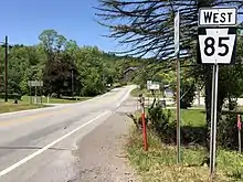 PA 85 begins at an intersection with PA 28/PA 66 in Rayburn Township, Armstrong County, heading east on a two-lane undivided road. The route passes through agricultural areas with some homes, running through the community of Green Acres. The road crosses the Cowanshannock Creek and heads through the community of Sunnyside, continuing northeast through woods and farms with some homes to the north of the creek and crossing into Valley Township. PA 85 curves southeast and winds east through wooded areas with occasional residences, passing through Greendale. The route heads through a mix of agriculture and woodland with some homes, continuing into Cowanshannock Township. The road runs through rural residential areas, passing through Rose Valley and Yatesboro. PA 85 crosses into the borough of Rural Valley and passes between housing areas to the north and woods to the south. The route crosses back into Cowanshannock Township and continues through a mix of farmland and woodland, passing to the south of the residential communities of Meredith and Nu Mine. The road intersects PA 839 and runs northeast and east through more rural areas. The route runs through farmland and turns southeast at Hoosicks Mill.[2][3]