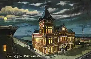 Pennsylvania Station was a railroad station in Cincinnati, Ohio, that served the Pennsylvania Railroad (PRR), for which it was named, and the Louisville and Nashville Railroad. Built in 1880, it stood at the corner of Pearl and Butler Streets just east of the L & N bridge.[1] Pennsylvania Station was one of two stations in Downtown Cincinnati served by the PRR.[2] The other was the Cincinnati, Lebanon and Northern Railway station on Court Street, after that line's acquisition by the PRR.