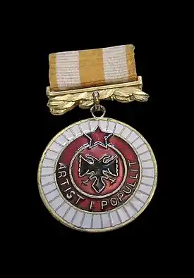 The People's Artist (Albanian: Artist i Popullit; Artiste e Popullit) was an honorary title for outstanding art performers of the People's Socialist Republic of Albania, whose merits were exceptional in the sphere of development of the performing arts (theatre, music, cinema and art). It was created by law in 1960 and amended in 1980. The title is no longer given in Albania after the law was amended in 1996. The equivalent of it became the "Grand Master of Work" title, that was also substituted with the "Grand Master" title after a 2001 amendment of the 1996 law.[1]