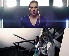 Stills from the "People Like Us" music video. The first (above) features Clarkson performing the song (as presented in color), it intersperses with black-and-white scenes of her portraying a scientist in a research facility with the girl in full color (below). Pilliero utilized color as a rhetorical device to distinguish the antagonists (in monochrome) from the misfits or "people like us" (in color).[20]