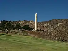 The most distinctive feature of the Malibu campus, apart from its location, is the Phillips Theme Tower, a 125-foot obelisk with an embedded cross that stands on the front lawn. The tower was designed by William Pereira in 1972, and construction was completed in 1973.[45] The tower was dedicated in 1974 as a symbol of Pepperdine's dedication to its Christian mission. Following disputes with Malibu residents over the lighting of the cross, the tower has not been illuminated since 1980.[46]