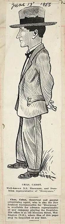 Charles Cabot was a well known entertainer born in Wellington who travelled in 1912 on horse and cart with circus groups and also worked in Australia.[21]