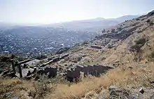 The Caicus valley is mostly composed of volcanic rock, particularly andesite and the Pergamon massif is also an intrusive stock of andesite. The massif is about one kilometre wide and around 5.5 km long from north to south. It consists of a broad, elongated base and a relatively small peak - the upper city. The side facing the Cetius river is a sharp cliff, while the side facing the Selinus is a little rough. On the north side, the rock forms a 70 m wide spur of rock. To the southeast of this spur, which is known as the 'Garden of the Queen', the massif reaches its greatest height and breaks off suddenly immediately to the east. The upper city extends for another 250 m to the south, but it remains very narrow, with a width of only 150 m. At its south end the massif falls gradually to the east and south, widening to around 350 m and then descends to the plain towards the southwest.[5]