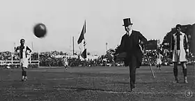 The United States ambassador to Peru, Miles Poindexter, kicking off before the Peru v. Argentina match played at South American Championship in Lima.
