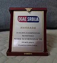 OGAE Serbia Award for the best song on Pesma za Evroviziju '23 is voted on by the association members. The award was won by the winning song "Samo mi se spava" with 275 points. In second place, with 262 points, was "Novi plan drugi san" by Filip Baloš, while the third place went to Zejna and her song "Rumba" with 174 points.[23]