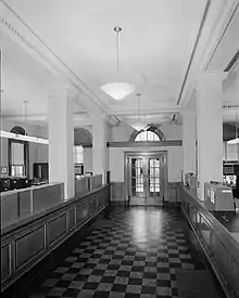 The layout of the interior rooms plan has changed several times, nowadays revealing little evidence of the original arrangement. The first floor is primarily a large open public area containing municipal service areas. The second and third floors are divided into city offices. The interior columns and staircases are original.[3]