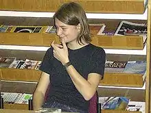 Hůlová rapidly rose to popularity in 2002 with the publication of her début novel Paměť mojí babičce, which became one of the most widely read Czech books of the decade.[2] The novel is told from the point of view of five female narrators from three generations of the same Mongolian family. She chose to set the novel in Mongolia to avoid the necessity of writing about "artificial phenomena" such as career and media, by which she felt Mongolia had been less "polluted" than Europe; this allowed her to focus on writing about the basic feelings of her characters.[4] The novel won a Magnesia Litera Prize as Discovery of the Year,[5] and was voted Book of the Year by the Czech daily Lidové noviny.