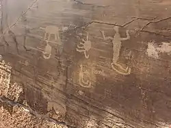 A portion of the canyon measuring approximately 800 feet (240 m) long features numerous prehistoric petroglyphs, both on the canyon walls and on boulders. At least eighteen different groups of carvings are known, in addition to features such as hearths and small pieces of stone resulting from the manufacturing process for stone tools. Most of the petroglyphs were created by "pecking" tiny holes, although one group is formed of lines that were clearly engraved into the rock.[1]:2 The majority of designs at Petroglyph Canyon feature humans or large game animals such as bison and bighorn sheep. Some carvings clearly feature men or women, many of which appear with sexual imagery such as phallic symbols or external female genitalia respectively.[1]:3 Some of the carvings are old enough that they have begun to weather to the dark color of the surrounding stone, but most show little sign of erosion. A few designs at the site, such as personal names, have obviously been added much more recently by vandals, but such carvings are rare and were typically placed near older designs instead of on top of them.[1]:2