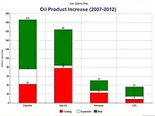 In 2012, Iran, which exported around 1.5 million barrels of crude oil a day, was the second-largest exporter among the Organization of Petroleum Exporting Countries.[7] In the same year, officials in Iran estimated that Iran's annual oil and gas revenues could reach $250 billion by 2015.[8] However, the industry was disrupted by an international embargo from July 2012 through January 2016.[9][10] Iran plans to invest a total of $500 billion in the oil sector before 2025.[11][12]