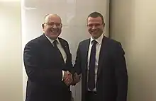 In May 2016, Orpo announced that he would challenge the chair of the National Coalition Party and incumbent Minister of Finance Alexander Stubb in June's party conference.[8] At the time, Orpo joined second-term parliamentarian Elina Valtonen in seeking to replace Stubb.[9] In contrast to polyglot and outspoken Stubb, Orpo was widely seen as a careful consensus-seeker with little experience of international politics.[10] Orpo received 441,4 votes against Stubb's 361 and was thus elected as the new chair for the party.[11] Orpo soon announced that he would take Stubb's seat as the Minister of Finance.[12] He was officially appointed as the Minister of Finance on 22 June 2016.[13]