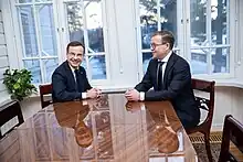On 27 April, it was announced that Orpo would begin final negotiations with the Finns Party, the Swedish People's Party and the Christian Democrats to form a coalition government.[21][22] This coalition of parties was confirmed on 15 June,[23] with the government formation, including the names of its ministers, announced on 17 June.[24] His party won eight cabinet posts, the Finns Party seven (including the Ministries of Finance, the Interior and Justice), while the Swedish People's Party and the Christian Democrats shared the remaining five. Petteri Orpo heads Finland's most right-wing government since the end of the Second World War