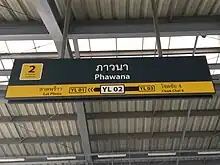 Phawana station (Thai: สถานีภาวนา) is a Bangkok MRT station on the Yellow Line. The station is located on Lat Phrao Road, near Soi Lat Phrao 41 (Soi Phawana) in Huai Khwang District, Bangkok. [1] The station has four entrances. [2] It opened on 12 June 2023 as part of trial operations on the line between Hua Mak and this station. [3][4] The final section between Phawana and Lat Phrao opened on 19 June 2023. [5]