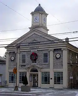 Phelps Town Hall is a historic town hall located at Phelps in Ontario County, New York. It was built in 1849 and remodeled in 1912–1913. It is architecturally significant as a Greek Revival style town hall with distinguished Neoclassical style modifications. It features an elegant clock tower with paired, fluted Corinthian columns.[2]