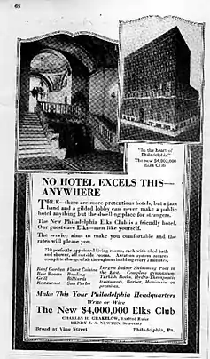 This lodge, built between 1922 and 1925, was a thirteen-story building. The BPOE moved into the new lodge from the four-story building located at 1320–1322 Arch Street, built between 1904 and 1906, and designed by Francis Caldwell and Edward Simon, that still stands.[2][3]