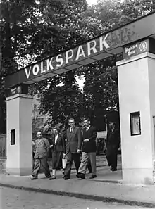 The first major symphony concert was held in January 1948 in the hall of the Volkspark.[1] However, the "efforts for more recognition" were accompanied by "political pressure", as chronicler Susanne Baselt summarised it.[3] At the end of the year, the Deutsche Volksbühne became the sponsor of the symphony concerts.[1] After Bohnhardt's resignation in February 1949, Kapellmeister Heinz Hofmann initially took over the direction of the orchestra on a provisional basis.[2] In particular, Alfred Hetschko, at that time music advisor in the Ministry of National Education of the state of Saxony-Anhalt, then initiated the change of name to "Landes-Volksorchester Sachsen-Anhalt" at the Landtag of Saxony-Anhalt.[2]