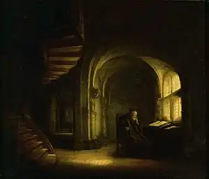 While the traditional title Philosopher in Meditation has to a large extent been responsible for the painting's popularity, it is iconographically untenable. The painting shows none of the conspicuous attributes of scholarship or philosophy—books, globe, scientific instruments, etc.—and the presence of at least one other figure involved in domestic tasks does not fit in with the solitude associated with study and meditation.[25] Though a large book and a quill seem to be among the few objects on the table in front of the main figure, they are summarily depicted and impossible to identify more precisely: a Bible alone would not suffice to make the figure depicted a scholar or "philosopher." Staircases—whether spiral or not—were not an attribute of philosophy in the early 17th century. Similar observations argue against identifying the main figure as an "alchemist," a subject that would allow for other figures, such as an assistant tending a fire.