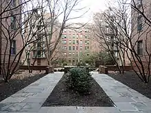 Phipps Garden Apartments is an apartment complex in Sunnyside Gardens, Queens, New York City. It was built in 1931 by Phipps Houses, a philanthropic organization of the Phipps family to build model tenements for working-class families, along with Henry Wright of Sunnyside Gardens.[1] It is located on 39th Avenue between 50th and 52nd Streets, adjacent to Sunnyside Gardens Park and Sunnyside Yard. Designed by Clarence Stein,[2] The brick buildings feature intricate brick work and curved steel fire escapes. The buildings enclose a landscaped courtyard by landscape architect Marjorie Sewell Cautley.