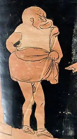 Phlyax actor as a slave from a Sicilian chalice-krater by a painter of the Lentini-Manfria Group, c. 350–40 BCE (Louvre)