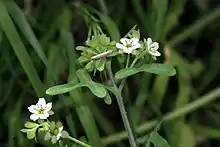 The inflorescence consists of cymes of 2 to 10 flowers each under a centimeter wide. Each pedicel is 5–20 millimetres (0.2–0.8 in). Calyx lobes are oblong and 1–3 millimetres (0.04–0.12 in). The flower is white, usually with a purple spot or streak on each of its five lobes.[2]