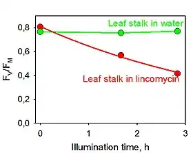 Effect of illumination on the ratio of variable to maximum fluorescence (FV/FM) of ground-ivy (Glechoma hederacea) leaves. Photon flux density was 1000 µmol m−2s−1, corresponding to half of full sunlight. Photoinhibition damages PSII at the same rate whether the leaf stalk is in water or lincomycin, but, in the “leaf stalk in water” sample, repair is so rapid that no net decrease in (FV/FM) occurs