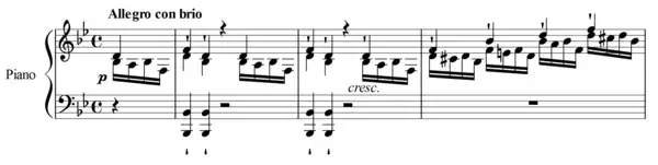The fourth movement is in a rondo form: A–B–A–C–A–B–A–Coda.[2] The first "A" theme starts in the tonic key, and the "B" theme transitions into the dominant key with big grand arpeggios in the right hand using a good portion of the keyboard. After the arpeggios, both hands play around with the "A" theme's melody before arriving back to the tonic key at the second "A" theme (with very little deviation from the first "A" theme). Suddenly, the "C" theme begins with a key change into B♭ minor (although not marked in the key signature). The sharp forte chords, although in stark contrast with the rest of the rondo, bear some resemblance to the first few chords of the "B" theme. The right hand then plays urgent thirty-second notes while the left hand supports with staccato sixteenth notes. This reaches a climax, a call-and-response play on the beginning of the "C" theme, and the thirty-second-note passage with the climax again.