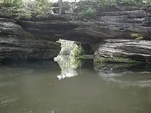 The park was developed by the Civilian Conservation Corps (CCC) between 1934 and 1942 on about 12,000 acres (49 km2) of land donated to the State of Tennessee in 1933 by the Stearns Coal and Lumber Company. CCC crews built hiking trails, a recreation lodge, a ranger station, five rustic cabins, and a 12-acre (4.9 ha) lake known as Arch Lake. Locally quarried sandstone was used in constructing most of the buildings. The original park facilities are listed on the National Register of Historic Places.[1] Pickett's land area has increased over time as a result of additional land donations and acquisitions,[4][5] and additional park facilities were built beginning in the 1950s.[2]