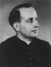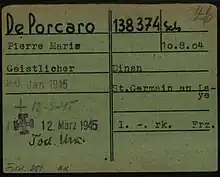 De Porcaro was called up when war broke out in 1939, and he was captured, along with the rest of his unit, during the Battle for France in June 1940.[2] He was originally sent to Stalag IX-B as a prisoner of war, but was subsequently released as "clean" in August 1941.[3] Returning to Saint-Germain, he continued his work as a local priest until 1943, when the Bishop of Versailles, Monsignor Roland-Gosselin, asked him to travel to Germany and minister clandestinely to French forced labourers.[3] Catholic priests were under great danger in Germany, but de Porcaro accepted the mission, writing: