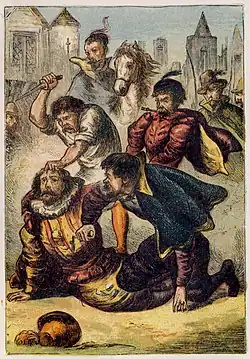 Duke Pierre de la Place (ca. 1520, Angoulême – 25 August 1572, Paris) was a French Huguenot martyr, who died a few days after the 1572 St. Bartholomew's Day Massacre of the Huguenots. According to Foxe, he was informed of the massacre, and ordered to report to the King, to await the King's pleasure. He fled, but was unable to find shelter with any Catholics, and eventually returned to his house and fortified himself in, leading his wife and servants in prayer while he waited. He was eventually obliged to leave with the King's men, who led him into the clutches of assassins who killed him. His corpse was placed in a stable, where it was desecrated with horse dung (later thrown into the river), and his house was plundered.[1]