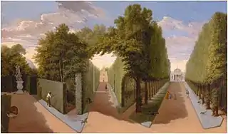 He also established a reputation with his topographical landscapes and portraits of country houses and gardens. He made two series of paintings of Chiswick House and Gardens upon the commission by Lord Burlington.[3] The purpose of the paintings was to serve as a reminder to Lord Burlington of the progress of the work on the Palladian villa and its setting, which Burlington had designed himself. Work on Chiswick House and Gardens had commenced in 1717 and was completed in 1729. The paintings were probably displayed in Lord Burlington's various other properties such as Burlington House and at his Yorkshire country seat.[5] The series of paintings had an important influence on the fashion for sets of garden views that emerged in the second quarter of the 18th century and gained further popularity with the rise of the picturesque movement.[3]