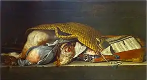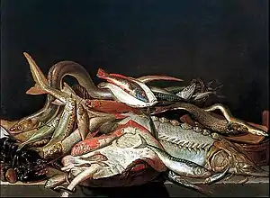He is known for his landscapes and still lifes. His still lifes cover the whole range of animal paintings, game pieces, fish pieces and fruit pieces.[2] The still lifes and game pieces where in the Flemish style. An example is the Still Life of Vegetables, a Pineapple and Other Fruit with a Silver Platter on a Ledge (Corpus Christi College, Cambridge).