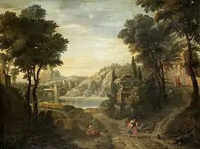 At international auctions landscape paintings of Rijsbrack more reminiscent of the classicizing style of his father are regularly offered for sale. An example is the Travellers in a classical landscape. A work in a similar style entitled A Southern Landscape with Muleteers is part of the collection at the National Trust, Hatchlands.[9]