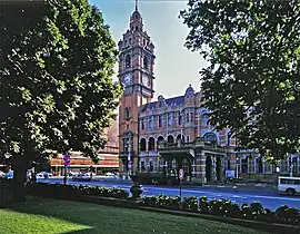 The buildings features a Flemish Renaissance Revival style and red brick façades. It comprises a 47 metre tall corner campanile.