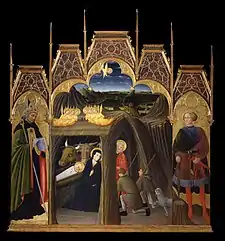 In 1446, he painted the Crucifixion mural at the Siena City hall (Palazzo Pubblico) and. two years later, completed another depiction of Saint Bernardino in Lucignano. He may have also participated in painting the cloister at the Monastery of the Holy Saviour in Lecceto. He and Vecchietta worked on а pair of reliquary shutters at Siena Cathedral; now in the Pinacoteca. Numerous small works from the late 1440s have been attributed to him.