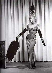 Originally, Monroe was to wear a breathtaking show girl costume, costing close to $4,000 (1953 dollars).[4] It had jewels sewn onto a black fish-net bodystocking up to the breasts, then covered in nude fabric, embellished with a mass of diamonds.