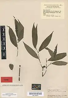 In the original 1828 description of the species, Czech botanist Carl Borivoj Presl named it Piper salicinum, citing as the authority Philipp Maximillian Opiz, and localized it to Mexico and Panama.[2] In 1844, the Dutch botanist, Miquel, also wrote that the species (which he named Artanthe saliunca), was from Mexico and Panama, but questioned the locality.[6] The following year, Presl revised his assessment, naming the species Chavica salicina, and wrote (in Latin): "changing the place of origin to the Mariana Islands, since it does not occur in Mexico, nor in Panama, as indicated by Opiz."[7][8] The same is written by Presl on the undated labels of the herbarium specimens.[4]