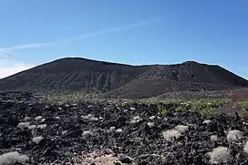 Pisgah Crater, or Pisgah Volcano, is a young volcanic cinder cone rising above a lava plain in the Mojave Desert, between Barstow and Needles, California in San Bernardino County, California. The volcanic peak is around 2.5 miles (4.0 km) south of historic U.S. Route 66-National Old Trails Highway and of Interstate 40, and west of the town of Ludlow.[2] The volcano had a historic elevation of 2,638 feet (804 m), but has been reduced to 2,545 feet (776 m) due to mining.[3]
