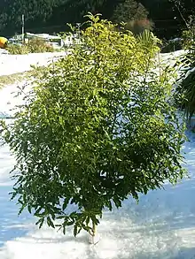 Pittosporum eugenioides, common names lemonwood or tarata, is a species of New Zealand native evergreen tree. Growing to 12 m (39 ft) tall by 5 m (16 ft) broad, it is conical when young but more rounded in shape when mature.[1] Its leaves are mottled yellow-green with curly edges and a salient bright midrib, and have a strong lemony smell when crushed.[2] It has highly fragrant clusters of attractive yellow-cream flowers in spring, followed by distinctive black seed capsules.[2] It is found throughout New Zealand's North and South Islands along forest margins and stream banks from sea level to 600 m (1,969 ft).[2] It is New Zealand's largest Pittosporum.[3]