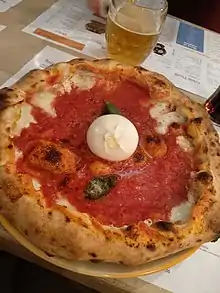 Pizza Margherita (also Margherita pizza in English)[1] is a typical Neapolitan pizza, made with tomatoes, mozzarella cheese, fresh basil, salt, and olive oil.