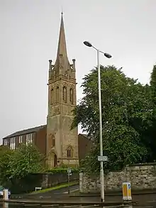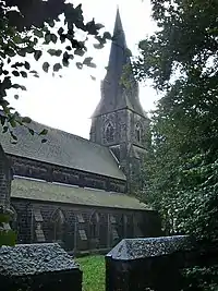 The tower and steeple of the church were listed Grade II.[32] The tower has been described by English Heritage as being of coursed squared sandstone in a square planned perpendicular style. It had angle buttresses, a vice at the north-east corner, an offset to the belfry stage and an embattled parapet. The spire was splay-footed with lucarnes in the non-cardinal sides. The east side of the tower had a moulded Tudor-arched doorway which led to the former nave. The structure was de-listed on 14 September 2001.
