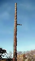 After the plaza was named, Canadian Ambassador Richard Plant Bower worked to arrange the delivery of a totem pole from Canada to Buenos Aires.[6] In 1963, Kwakiutl carvers Henry Hunt and his son Tony Hunt Sr. were commissioned by Ambassador Bower to carve a 20-metre (66 ft) totem pole for the plaza.[7] Carved from a 2,000-year old British Columbia red cedar, the totem pole depicted an eagle, a killer whale, a sea lion, a beaver, and a cannibal bird called a hok hok. After being shipped to Buenos Aires, the pole was erected in Plaza Canadá in May 1964.[8]