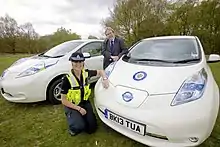 Nissan Leaf patrol cars deployed by the West Midlands Police, England. The Nissan Leaf, with 15,000 units sold by September 2016, has been the best-selling pure electric car in the UK since 2011.[93][94]