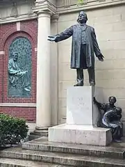 The church garden, fronting on Orange Street and located between the Church House and the Sanctuary, contains a statue of Beecher and a bas-relief of Lincoln. Both were produced by famed sculptor Gutzon Borglum, who later created the Mount Rushmore National Memorial.[1][2] An almost identical statue of Beecher is located less than a mile away, next to Cadman Plaza, in front of Brooklyn's historic Federal Building and Post Office.[66]
