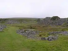 A sleeper block near King's Tor - ↑ The original Act had stated that the northern terminus was to be at Bachelor's Hall, an agricultural store built by Tyrwhitt. The Hall is still in existence: it is about 1 km east of Princetown, but it is at a considerably lower altitude; in fact an incline on a gradient of 1 in 8 would probably have been required to reach it. It appears that this aspiration was quietly dropped. An 1850 map reproduced by Kingdom in The Princetown Branch indicates a mine at this location, and Harris refers to it as a small-scale tin mine.[13]