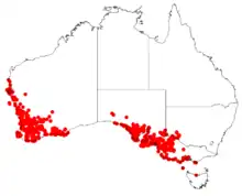 It occurs in southern parts of Australia.[3] It has been recorded from Tasmania but is now presumed extinct there.[6]