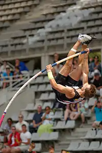 Pole vaulting, also known as pole jumping, is a track and field event in which an athlete uses a long and flexible pole, usually made from fiberglass or carbon fiber, as an aid to jump over a bar. Pole jumping competitions were known to the Mycenaean Greeks, Minoan Greeks and Celts. It has been a full medal event at the Olympic Games since 1896 for men and since 2000 for women.