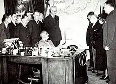 In 1944, Franklin D. Roosevelt assured Polish-American leaders that he would work for a strong and independent Poland, meeting with the Polish-American Congress and gaining key endorsements. FDR posed with Polish-American leaders in front of a large map of prewar Poland, creating imagery of an expanded Poland free from encroaching Soviet occupation. He made a pledge to uphold the Atlantic Charter relating to Poland in Chicago one week before the presidential elections. FDR won over 90% of the Polish-American vote, but gave in to Stalin's demands after World War II. In private conversations, FDR told Stalin that he was willing to give the USSR Poland's eastern region while taking land it lost to Germany, moving it westward. However, he indicated that he needed Polish votes to win his re-election and would not want to have his intentions with Stalin known because they were clear violations of his campaign promises.[17][18] FDR kept his promises to Stalin so secretive that even his successor, Harry Truman, was never informed of them. In Truman's first days in office, he called in the Russian foreign minister and dealt with him harshly, saying that Russia's new communist-imposed rule on Poland was a violation of its obligations and authorities under World War II agreements, and that it had exceeded its welcome after entering Poland to fight Nazi Germany. Truman later learned the extent of FDR's cooperation with Stalin and gave in, recognizing the Soviet-occupied regime as the legitimate Polish government.[19] During the Truman administration, U.S. Ambassador to Poland Arthur Bliss Lane resigned in protest after witnessing fixed elections in Poland. He spoke at a rally in May 1947, gathering 50,000 Polish-Americans who heard him denounce the U.S. appeasement policy towards the U.S.S.R.[20]