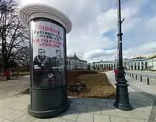 A poster of the Polish Judges Association "Iustitia" in front of the Supreme Court of Poland building in Warsaw calling for reinstatement of judges Igor Tuleya and Paweł Juszczyszyn