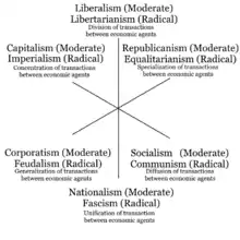 Some perspectives on politics view it empirically as an exercise of power, while others see it as a social function with a normative basis.[22] This distinction has been called the difference between political moralism and political realism.[23] For moralists, politics is closely linked to ethics, and is at its extreme in utopian thinking.[23] For example, according to Hannah Arendt, the view of Aristotle was that "to be political…meant that everything was decided through words and persuasion and not through violence;"[24] while according to Bernard Crick "politics is the way in which free societies are governed. Politics is politics, and other forms of rule are something else."[25] In contrast, for realists, represented by those such as Niccolò Machiavelli, Thomas Hobbes, and Harold Lasswell, politics is based on the use of power, irrespective of the ends being pursued.[26][23]