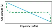 This graph is a schematic representation of the problematic sloping discharge curve (blue) of a conductive polymer battery, compared to the voltage plateau of a non-conjugated or organic radical polymer batter discharge curve (green).